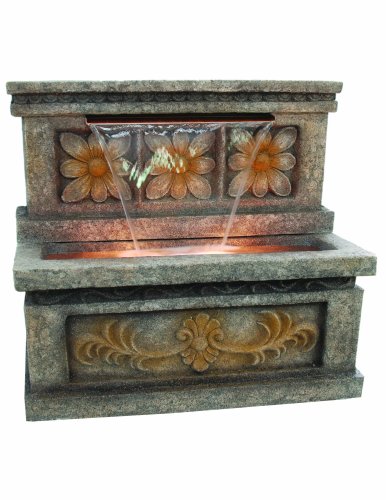 A charming, whimsical addition to any garden or patio, the Abigail is shaped like two stairsteps with a sheet of water flowing from the top step into the basin below. The inlays on the front of each step feature a lovely flower pattern. The lights in the basin cast a soft glow over the face of the fountain.