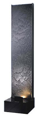 The Midwest Tropical Aqua Straight Floor Fountain features cascading tropical water in a therapeutic motion pulsating off the bed of polished rocks below. An adjustable flow of water ripples over the metallic acrylic face. The surface of this fountain has a rippled texture, which highlights the beauty of the falling water. Internal water pump and waterproof LED lighting with interchangeable color filters of blue, green, red, and yellow are concealed on the top or under the river rocks within the base. It plays the tranquil rhythms of rippling water while providing the perfect balance of humidity. Available in chrome, copper or gold metallic finishes.