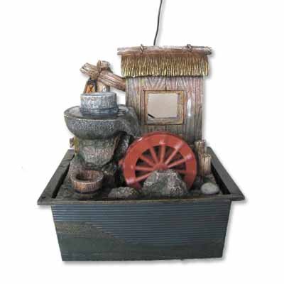 This fountain features a decorative wheel which rotates from the water dispensing from the top.